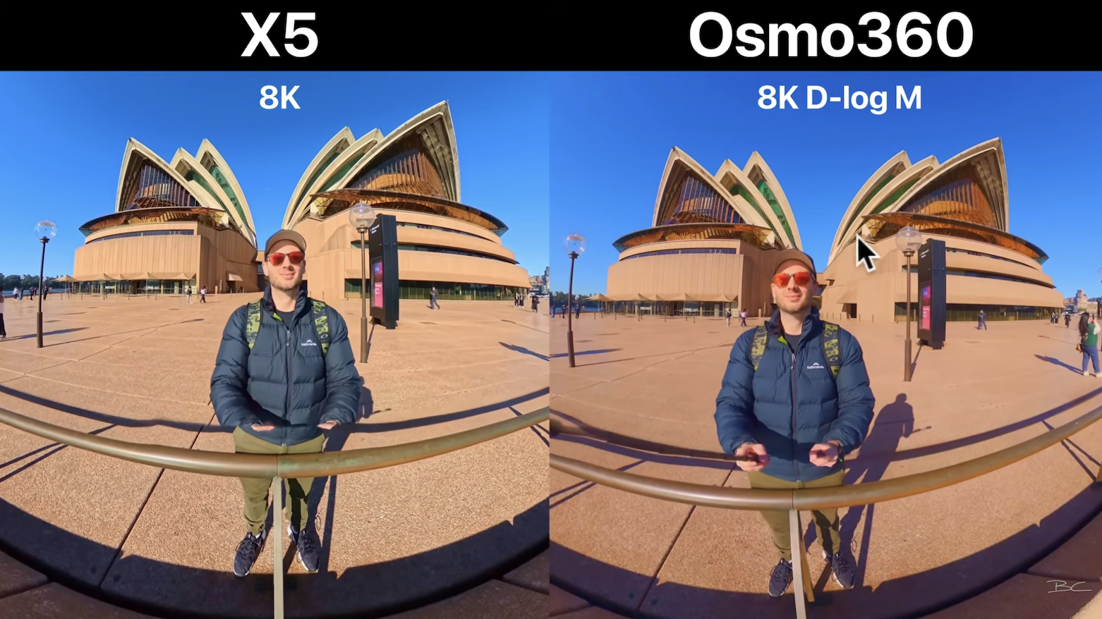 Both cameras show a noticeable stitching seam between lenses, with some blurriness. The X5 lets you adjust stitching settings in software, sometimes improving results, but the Osmo doesn’t offer that option yet.
