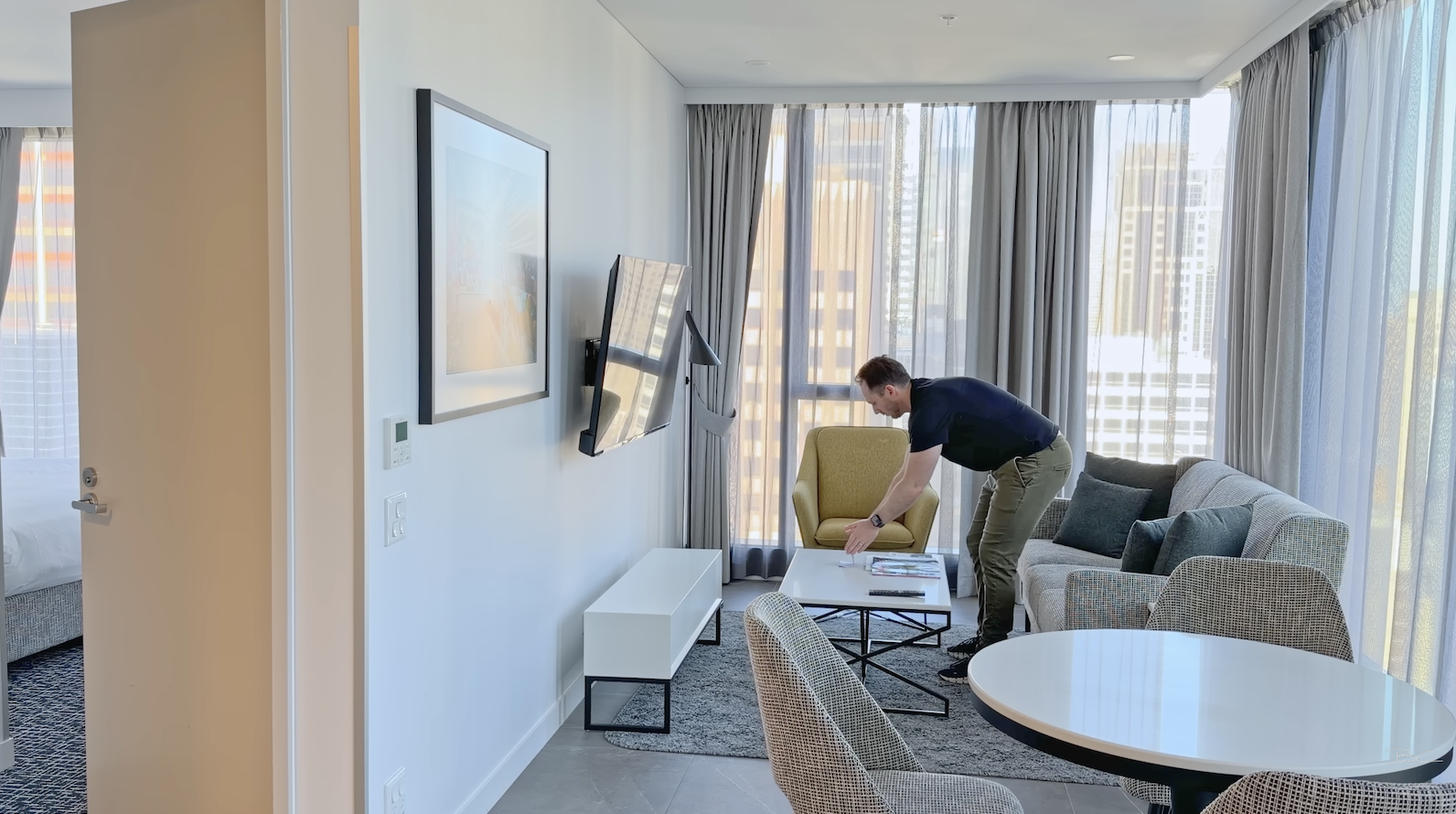 Before turning the camera on, it’s important to make the space look presentable. Even if the location is already tidy, it’s worth doing a quick walk-through to remove clutter, hide rubbish bins, fluff pillows, and tidy any surfaces that might distract from the room.