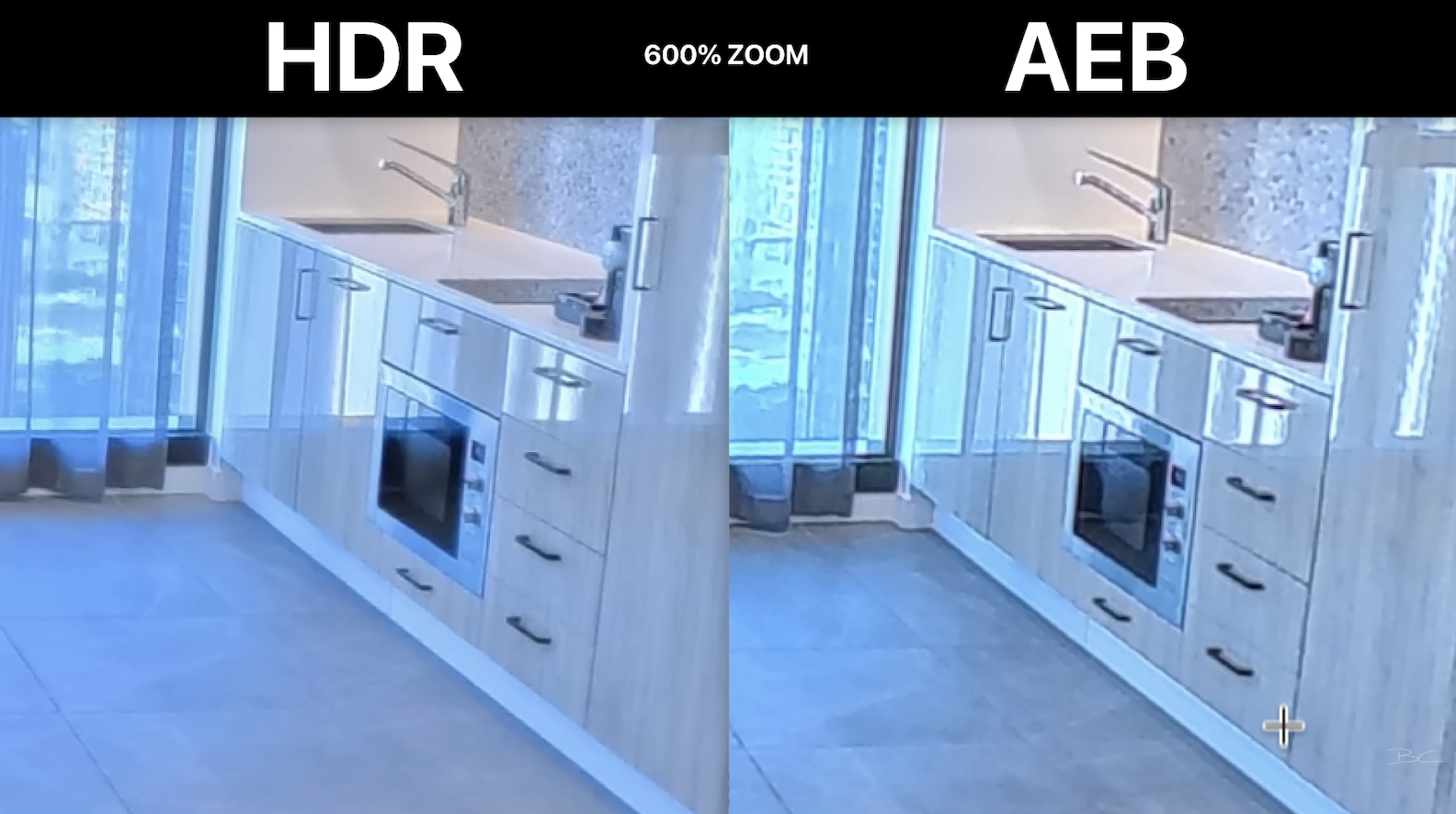 While many real estate photographers use auto exposure bracketing, the Insta360 X5 produces better results with HDR. Bracketing tends to introduce more noise, reduce texture quality, and slightly distort straight lines, especially around high-contrast areas. HDR photos are cleaner, sharper, and much faster to capture — which becomes especially important when shooting larger locations.