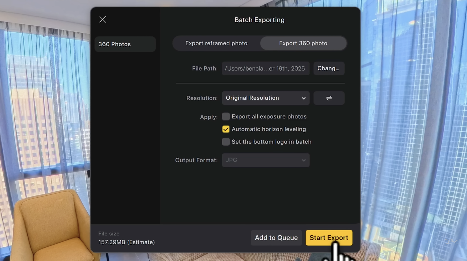 If you’ve taken multiple shots in the same space, you can use batch settings to apply the same adjustments across several images at once, which is a major time-saver.