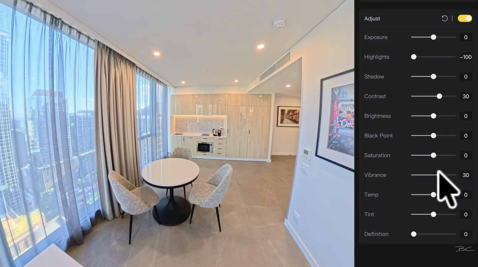 Basic colour correction can be done directly inside Insta360 Studio. I usually reduce highlights to control bright windows, add a small amount of contrast, and slightly increase vibrance. The changes are subtle but help the image feel more polished without overprocessing it.