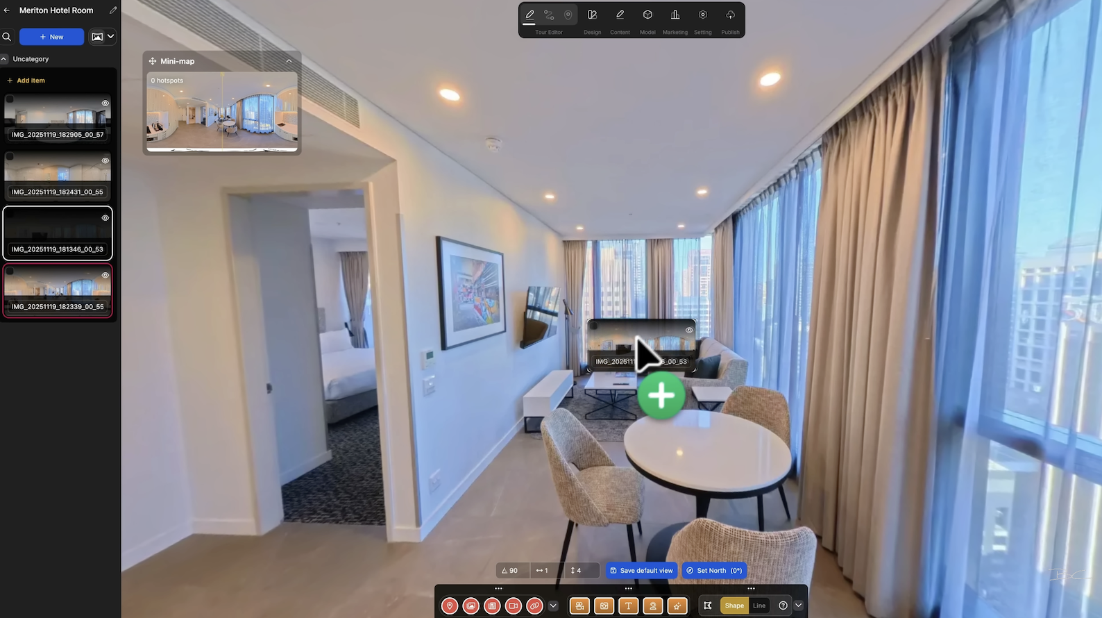 Once you’ve created an account, you simply start a new project, upload your 360 images, and connect them by dragging one scene to another. Hotspots are created automatically and can be renamed, styled, and repositioned as needed, making the whole process quick and straightforward.