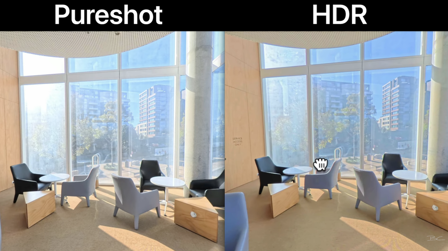 I tested them side by side. On the left, a standard PureShot image straight from the camera; on the right, an HDR photo processed in Insta360 Studio.